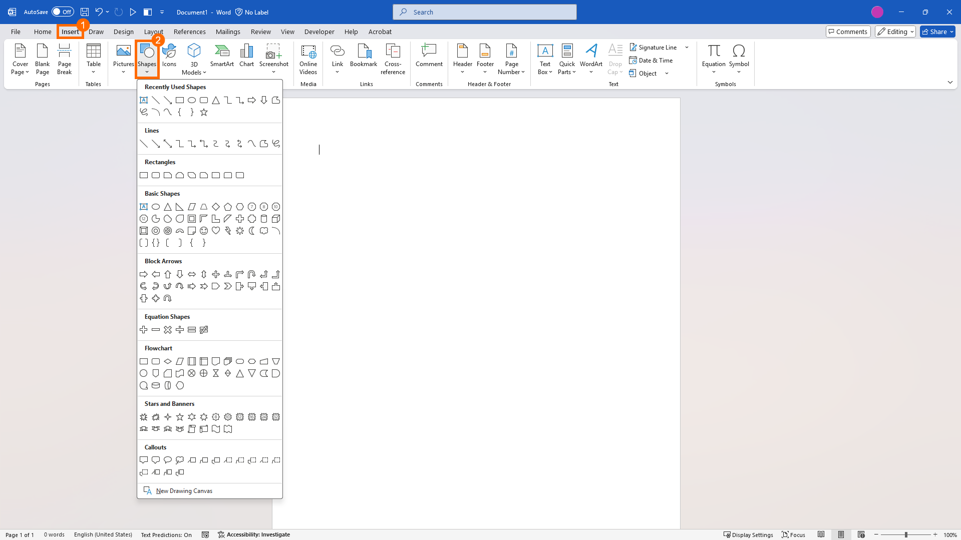 Now that the Shapes section is open, you can begin adding Shapes. First, insert a Microsoft Shape into the document. Go to the Insert tab in the taskbar and click on Shapes. Choose your preferred shape and draw it in the document.